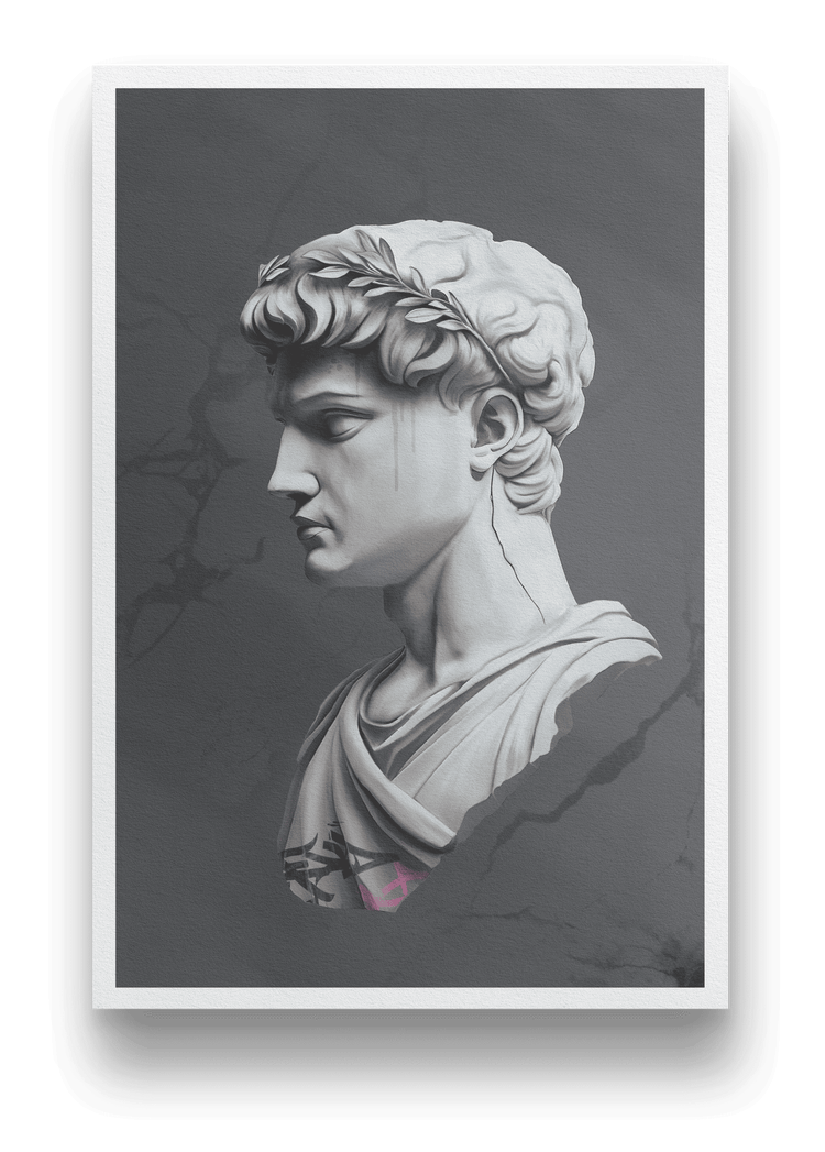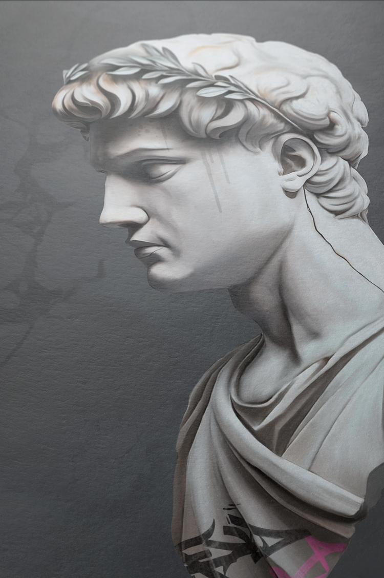 This experience inspired my series of paintings. Each work depicts a marble bust in varying stages of decay, with graffiti defacing the surface.