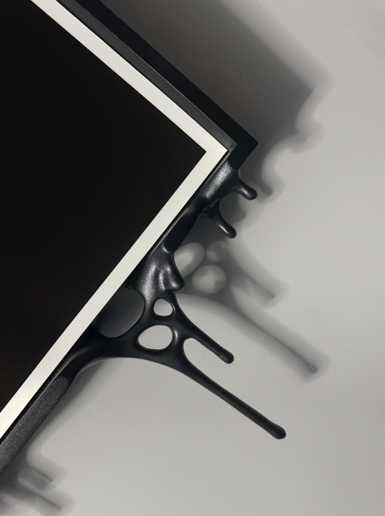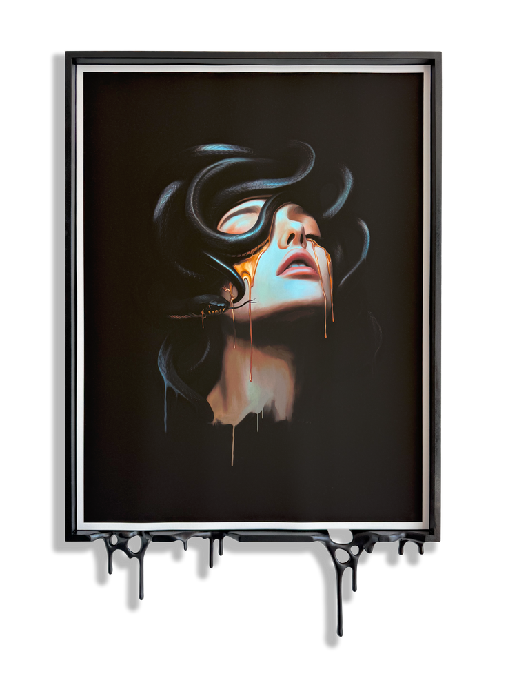 The print is finished in a hand-sculpted drip frame, crafted from clay to echo the artwork’s melting, surreal edge. It’s not just a frame—it’s an extension of the piece itself, as if Medusa is dissolving into our world.