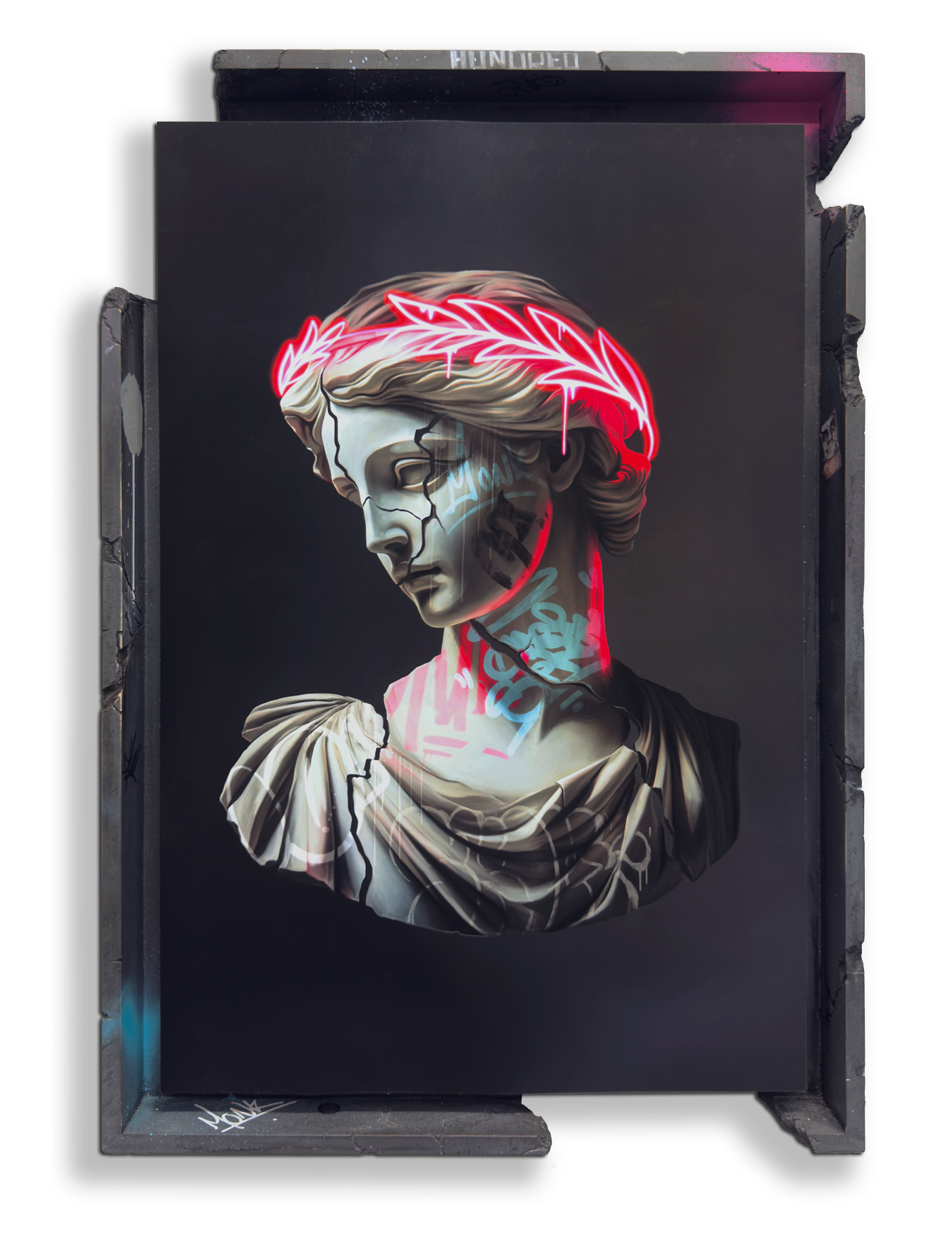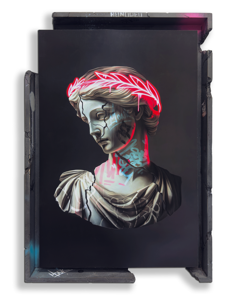 The frame itself, sculpted to evoke shattered stone and urban ruin, mirrors her decay. Together, image and frame form a relic of a civilisation eroded, wisdom reduced to noise, and guiding icons lost in the static of modernity.